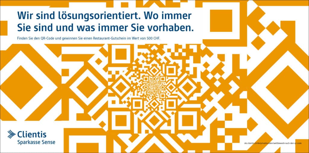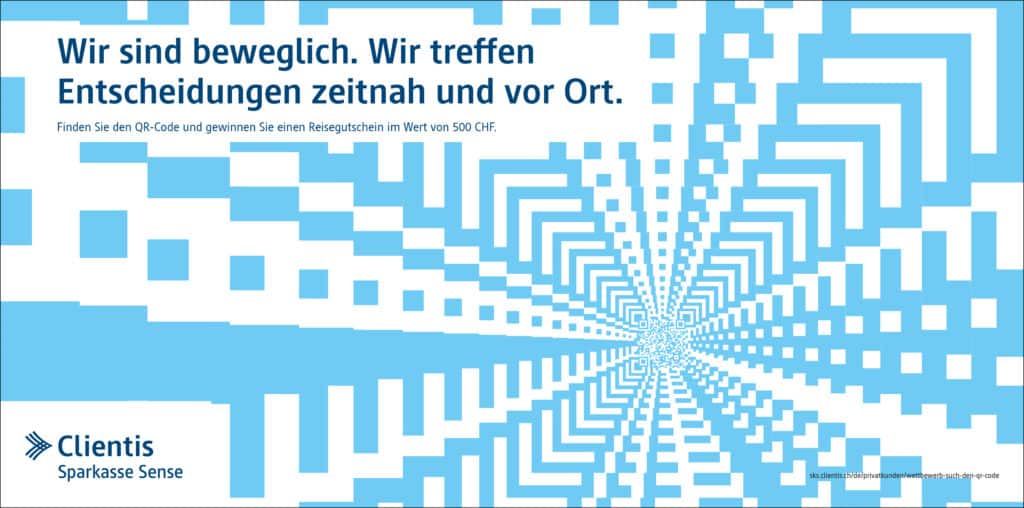 Die Clientis Sparkasse Sense wollte mit einer aussergewöhnlichen Inserate auf sich aufmersam machen. Den Sensler:innen sollte etwas gezeigt werden, was anders ist, als wie sie die Bank bisher gesehen haben. Mit verschiedenen Entwürfen zeigten wir verschieden Wege auf. Der QR-Code als Ausgangslage und die abstrakte Darstellung der Heads passte sofort.